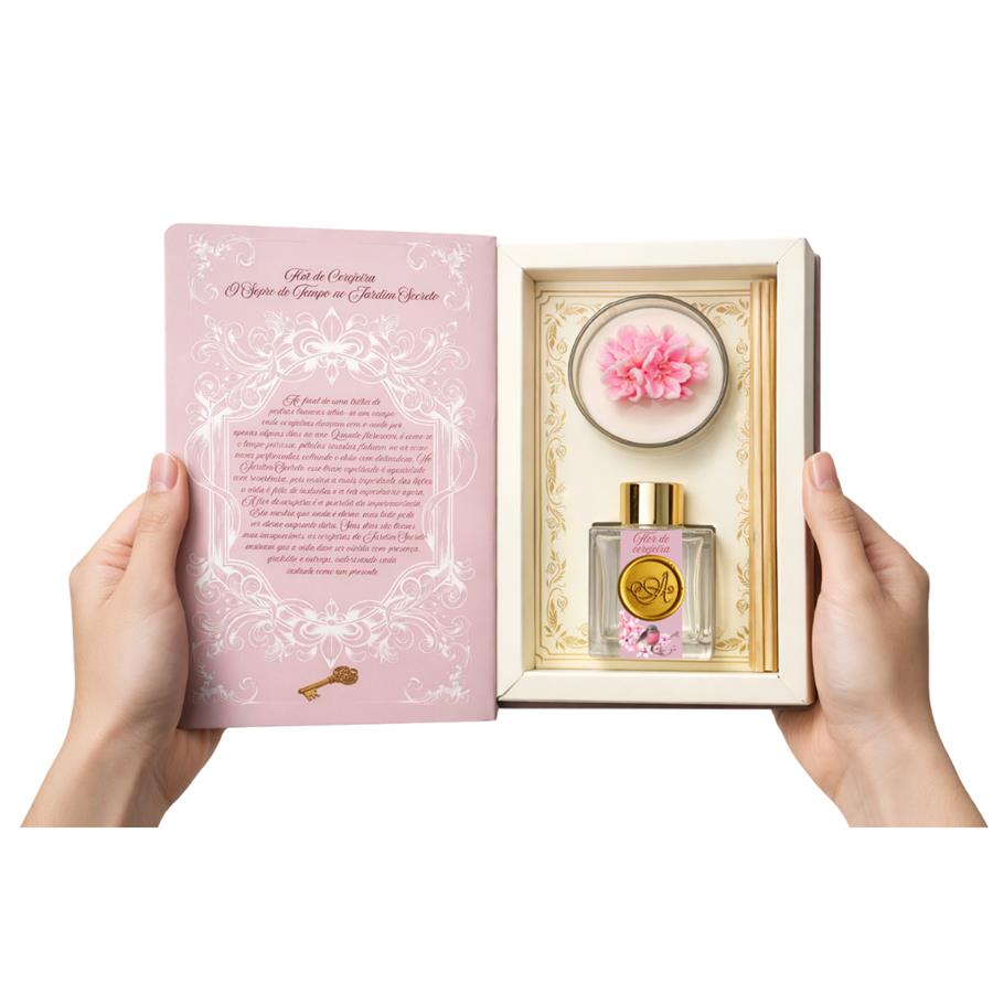 A composição inclui uma caixa em formato de livro, desenvolvida com cuidado e riqueza estética, que traz um conto exclusivo inspirado na Flor de Cerejeira, convidando a um momento de pausa, contemplação e sensibilidade. Em seu interior, o kit é composto por um difusor de ambientes de vidro 100ml e uma vela aromática de 115g, ambos na mesma fragrância e com decoração harmonizada ao tema floral.