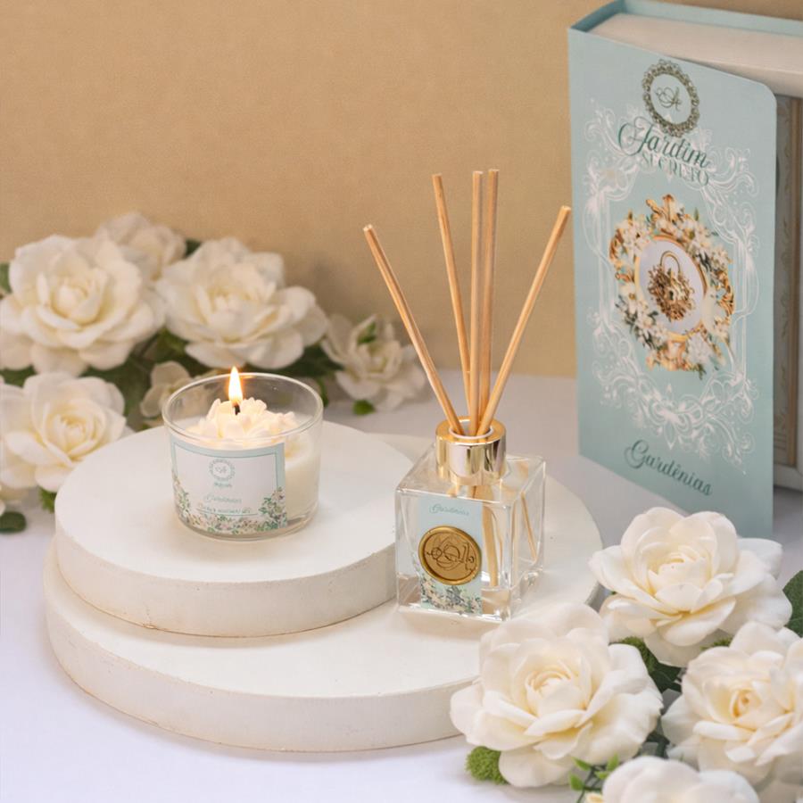 A composição inclui uma caixa em formato de livro, desenvolvida com acabamento refinado, que traz um conto exclusivo inspirado na Flor Gardênia, convidando a um momento de pausa, contemplação e sensibilidade. Em seu interior, o kit é composto por um difusor de ambientes de vidro 100ml e uma vela aromática de 115g, ambos harmonizados com a mesma fragrância e decoração temática da flor.