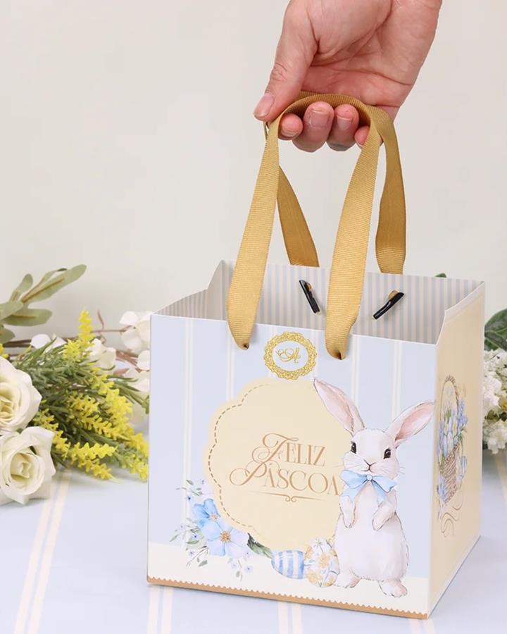 Sacolas de Páscoa com design delicado e acabamento encantador, ideais para acomodar os produtos da coleção Easter Garden, valorizando o presente e tornando a experiência ainda mais especial.
