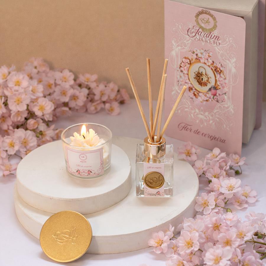 A composição inclui uma caixa em formato de livro, desenvolvida com cuidado e riqueza estética, que traz um conto exclusivo inspirado na Flor de Cerejeira, convidando a um momento de pausa, contemplação e sensibilidade. Em seu interior, o kit é composto por um difusor de ambientes de vidro 100ml e uma vela aromática de 115g, ambos na mesma fragrância e com decoração harmonizada ao tema floral.