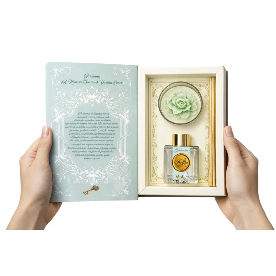 A composição inclui uma caixa em formato de livro, desenvolvida com acabamento refinado, que traz um conto exclusivo inspirado na Flor Gardênia, convidando a um momento de pausa, contemplação e sensibilidade. Em seu interior, o kit é composto por um difusor de ambientes de vidro 100ml e uma vela aromática de 115g, ambos harmonizados com a mesma fragrância e decoração temática da flor.